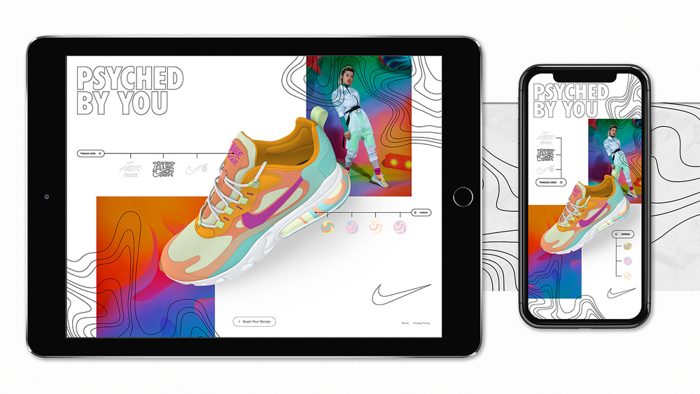 The Nike By You Art Movement pack focused on the psychedelic art movement as the creative direction. The hero of the collection was the Air Max 270 React. The Digital brand team utilized the playful nature of the footwear and the vast volume of psychedelic art as inspiration for the campaign. A SNKRS app thread and email campaign were used an drivers to the customization experience, while the landing page animation highlighted color and graphic customization, and added rhetorical elements from the psychedelic art movement and culture to further the direction and product narrative. The tout ran on the Nike By You landing page as well as the NSW landing page.